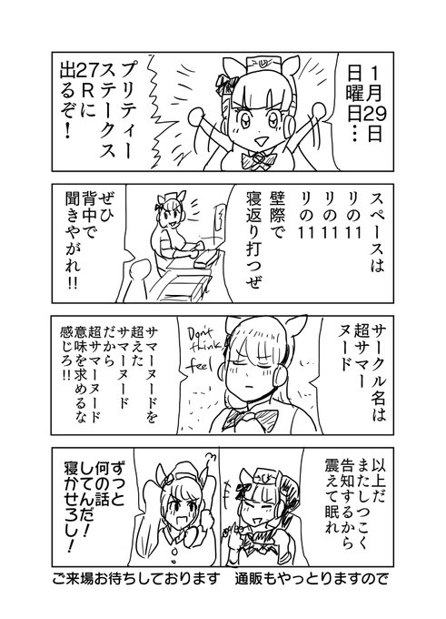 プリティーステークス27Rにて頒布予定です。原稿はこれからやります!一応セイウンスカイ日常系短編小説集を予定しております!どうぞよろしくお願いします。