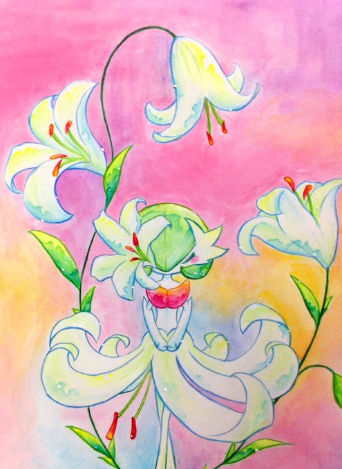 サーナイトと白いユリは色的にも花言葉的にもぴったりだと思って描きました✨少しカサブランカっぽくなったので反省…。そういえば今日はちょうどサーナイトの日みたいですね!!