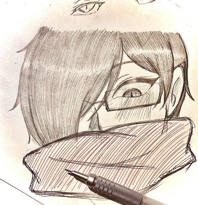 濃度を出すのが大好きなんですよ。かけあみを重ねるの大好きなんですよ。シャープペン一番軽く描くような感じです。ラフ絵。
