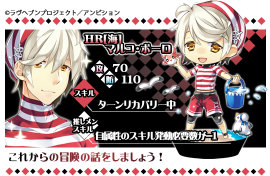 【予告】明日7/9の13:00より【レアガチャ】に追加予定の7月限定偉人【HR[海]マルコ・ポーロ】はこちら!海でもマルコ・ポーロの冒険のお話は長くなりそうな予感です♪日焼けしないように気をつけてくださいね☆ #ラヴヘブン