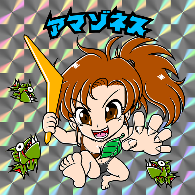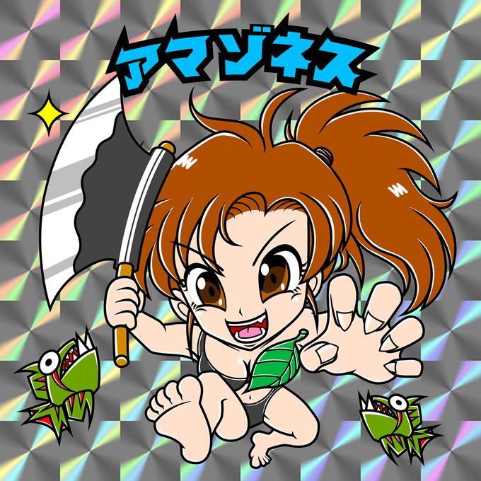 ビックリマン風〜ストライダー飛竜のアマゾネス描いた。斧版とブーメラン版。#レトロゲーム #レトロゲームギャル #ビックリマン風 #ビックリマンシール #ストライダー飛竜 #アマゾネス #ファンアート #カプコン