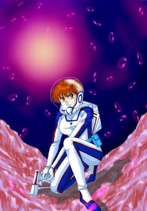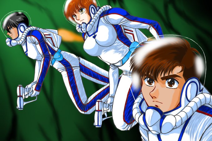 オリジナル艇外活動チーム三人、防護服姿でまとめて描いたのは初めてです。野郎の尻は色塗っててもあんま面白くなかった笑