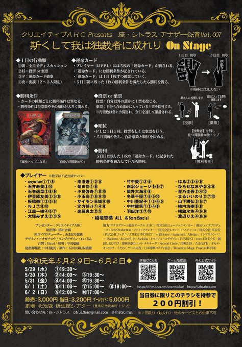 改めて、このたび参加させていただく事になりました舞台『斯くして我は独裁者に成れり』のお知らせです🔔5枚のカードのうち、どの運命で勝ち残るか。台本のないドラマ😱が始まる #我独