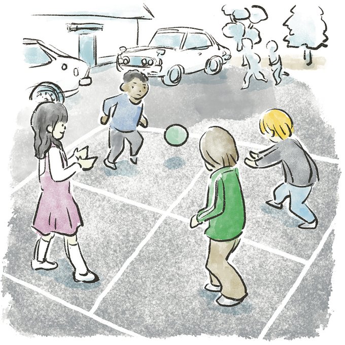 【31】でも、ここでも日本に助けられる。当時ペリースクールで昼休みに流行し始めていたのが「4スクエア」というボールゲーム。アスファルトにチョークで「田」の字を書き、それぞれの枠に一人が入って、互いの枠にボールをワンバウンドさせる遊びだ。 #向山貴彦 #金網の向こう