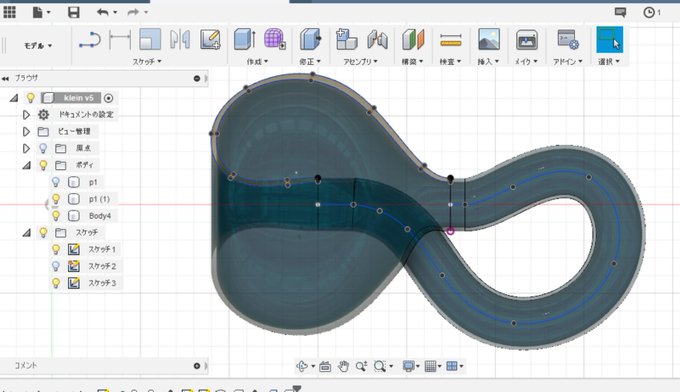 最近Fusion360を使ってなかったのでリハビリでクラインの壺をモデリングしてみました。作り方はいろいろあるのだろうけど、自分は「?」のネックをパイプ、底側を回転体で作ってうまく繋ぎ合わせる作戦で
