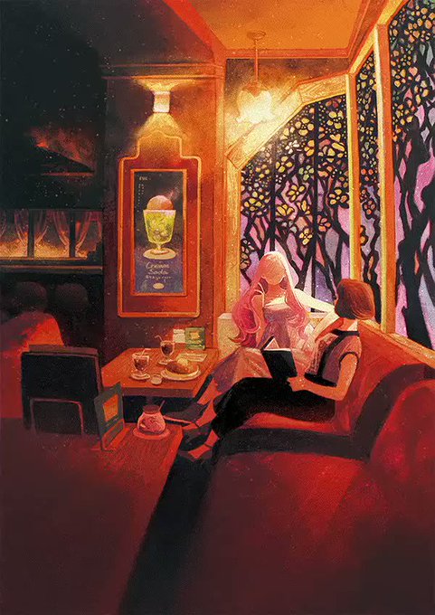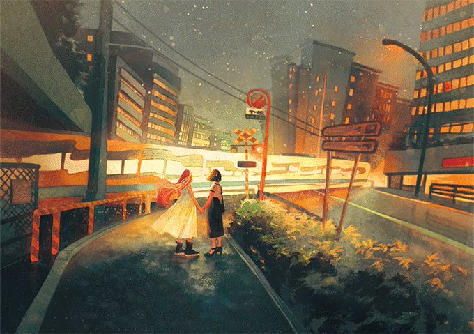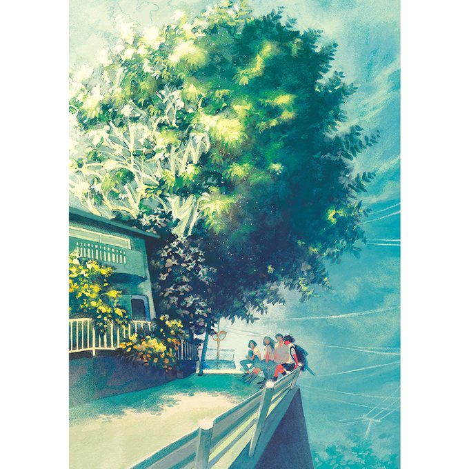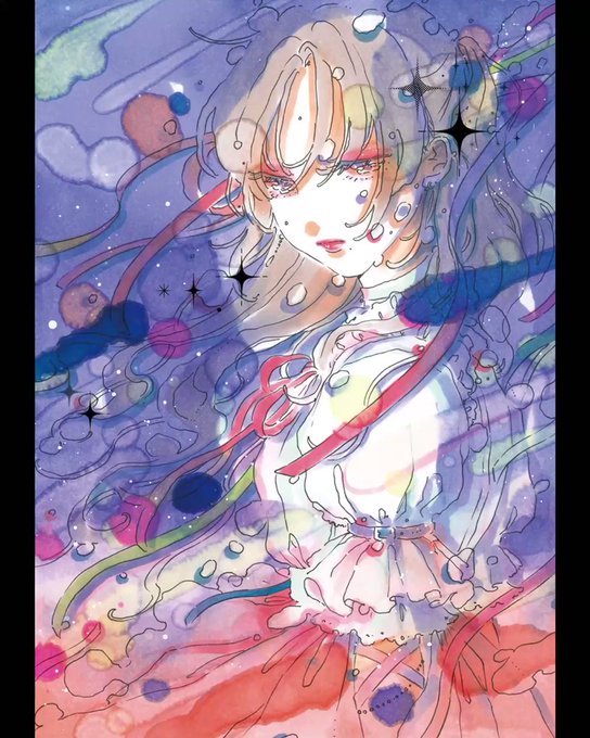 「薄明」の美しさを出すため、コピックインクで青〜赤のグラデーションを作っています。儚さと力強さが共存するような画面を目指しました。