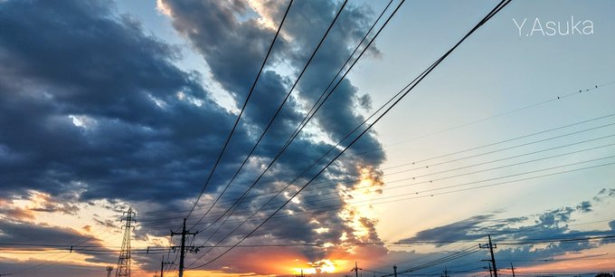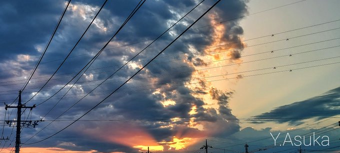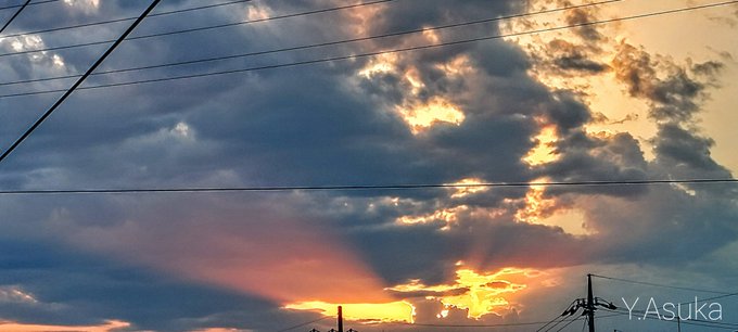 夕焼けビーム✨🌇✨ お疲れ様です🏁 西から東へ放射状に #黒雲 が 長~く広がり始めた日没前🌇 天に向うオレンジビームが キラキラとても綺麗でした✨ #薄明光線 #空の名前 #天気の図鑑 #雲友 #雲の教室 #層積雲 #積雲 #高積雲 #巻雲 #夕空 #夕焼け #鉄塔 #電柱 #電線 #a2021 #a1002 #a202110