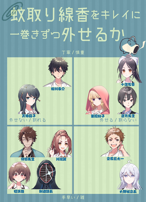夏らしいテンプレを見つけたのでトライ❣ 姪浜ちゃんは必ず割っちゃうし、企救丘君は何でも卒なくこなすし、小澄さん終日かけて全部の束を外してそう🤣 蚊取り線香一つでこんなに個性が出るとは・・・みんなは上手に外せる? https://t.co/nYCAWmYrR3