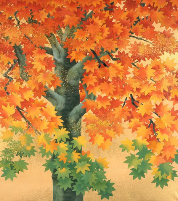 東近美展示中。春といえば川合玉堂《行く春》。渓谷に吹く風が盛りの桜を散らす。水の音。右隻には春の陽射しが深い渓谷に射し込んでいるのか、水面が光って見える。桜色の絨毯がそこかしこに。流れがうみだす青と桜。一心に仕事をする彼も手を止めふと桜の散る様を仰ぎ見ることでしょう。美しい風景。