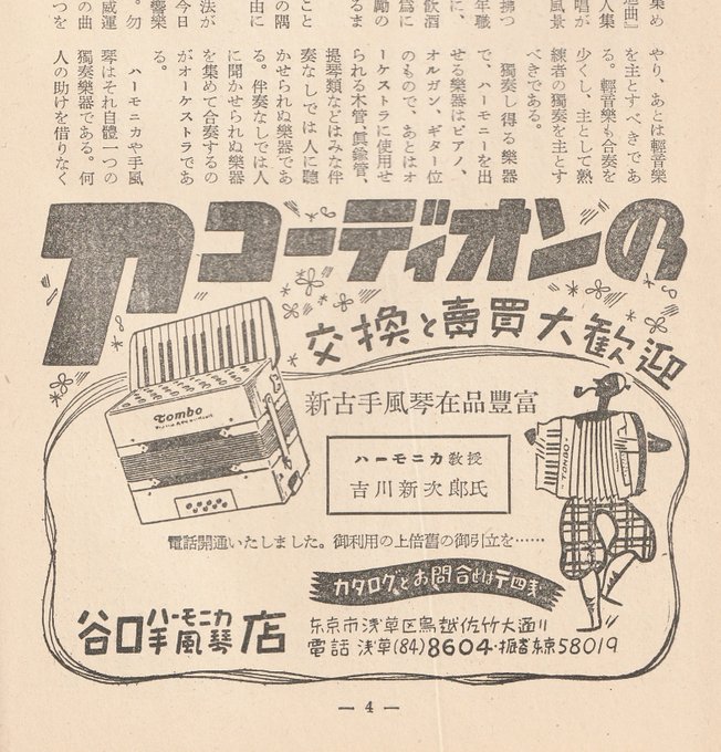 昔の谷口楽器 @freed_taniguchi の広告。「アコーディオンの交換と売買大歓迎」「新古手風琴在品豊富」「電話開通いたしました」。昭和13年(1938年)12月20発行の月刊『アコーディオン・ハーモニカ研究』第13巻・第1号「新年号」より。住所と電話番号は今と違うのでご注意ください(^^;;