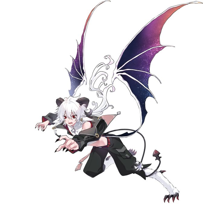 エンデビ悪魔のデザインの話していい?ありがとう とにかく縁起悪い感じにしたくて六文銭と結び切りと死装束と忌中札と白彼岸花入れて、上着を上から見たら五芒星になるようにして結び切りで円つくって魔法陣イメージしました 足裏には肉球 羽根の色は夕暮れから夜空 (オタク特有の早口)