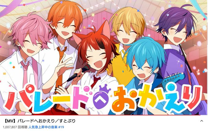 すとぷりの皆さんパレードへおかえり100万回視聴おめでとうございます㊗5日ぐらいしかたってないのにすごいですね!私は毎日聴いています。皆の好きなパートを意識して聴いています!皆の思いが詰められていてほんとに最高な歌です!これからもたくさん聴きます!