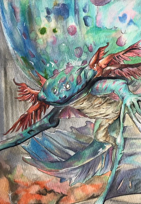 カードゲーマー45号にて、mtg『ラヴニカの献身』収録の青サラマンダー《プテラマンダー/Pteramander》が掲載されました…! 生体研究機関『シミック連合』が生み出した最新の小竜型モンスターです🐸 浮袋の透明感と湿っぽさに挑戦した1枚です…! #mtg #あなたのドラゴンを見せてください