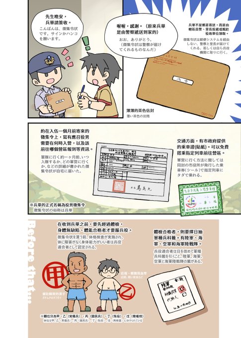 ではなく、徴兵制だった台湾の徴集令状は(自分の場合)警察が届いてくれました。チャイムが鳴って玄関ドアを開けたらニコニコしている警察が待っている貴重な経験を得ました。