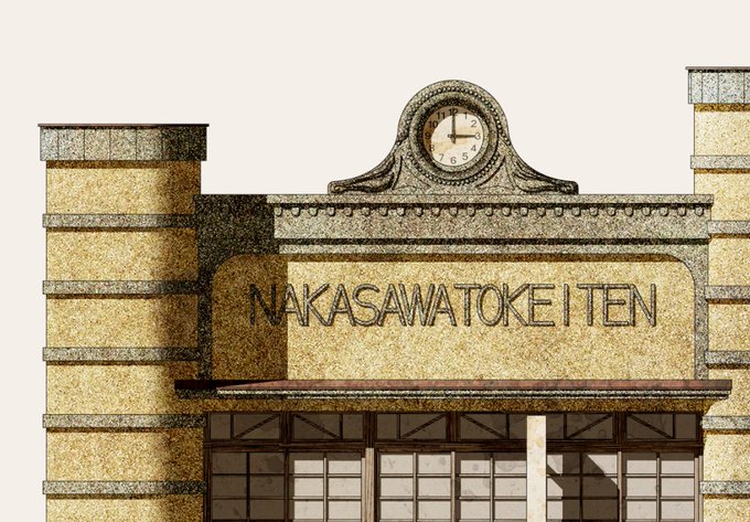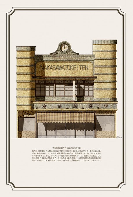「中澤時計店」を描きました。茨城県筑西市(旧下館)の大町通りに面して建つ旧時計店で、ファサードの左右にはアールデコ調の横ボーダーを廻した双塔を設け、そのサイズを非対称形とすることであえてシンメトリーを崩しています。強い造形。 #看板建築 #近代建築 https://t.co/UAh9jcViGe