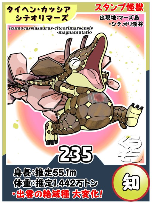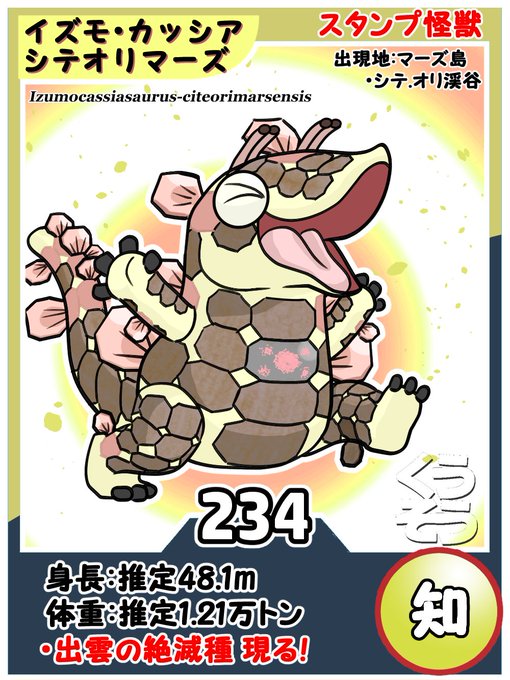 234.香気怪獣 イズモ・カッシア・シテオリマーズ/島根県でカッシア(中国産の常緑樹)の樹皮とともに化石が発見される。それの生き残りと思われるものがマーズ島に出現した。鱗が樹皮の様になっており、スパイシーな香りをはなつ。#知らない怪獣 #怪獣 #いつも感謝しております #くうそう