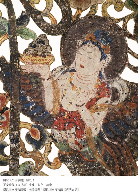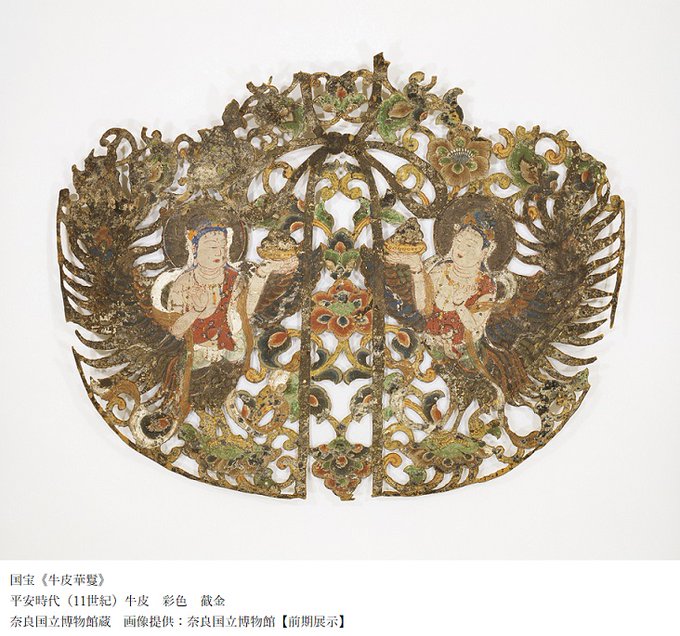 透かし切りをした牛皮に華麗な色彩で迦陵頻伽(極楽浄土に住む人面の鳥)を描いた、国宝《牛皮華鬘》。華鬘は寺院のはりや柱などにつける飾りであり、仏を讃えるための仏具です。寺院の空間演出に重要なものです。