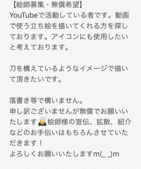 YouTubeで活動している者です。動画で使う立ち絵を描いて下さる方を探しております。落書きで構いません!よろしくお願いいたします🙇♂️💦 #イラスト募集 #絵師募集 #絵師さん募集 #絵師募集中 #アイコン募集 #イラスト依頼 #絵師さんと繋がりたい