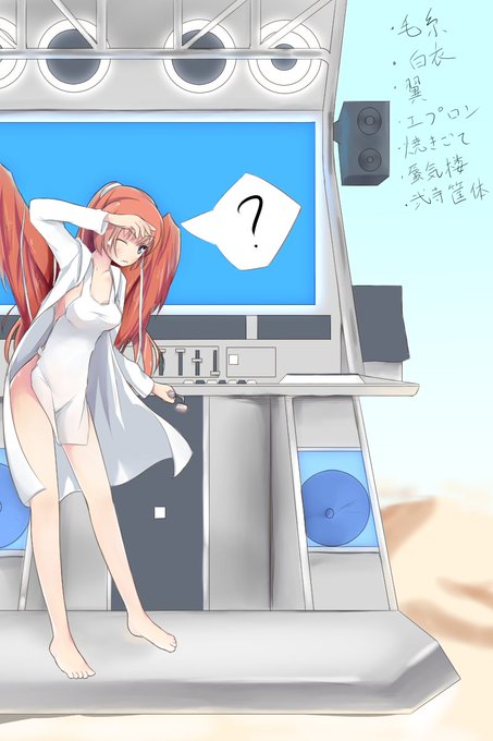 エプロンに白衣で翼に毛糸をまとい蜃気楼立つ灼熱の砂漠で焼きごてを使い弐寺筐体の修理を試みるシャム #裸のうちの子にフォロワーさんから言われたものを付け足していく