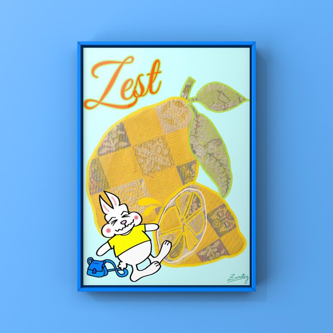 西陣織のはぎれアートxうさぎイラストのmix作品👘🐰✨