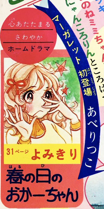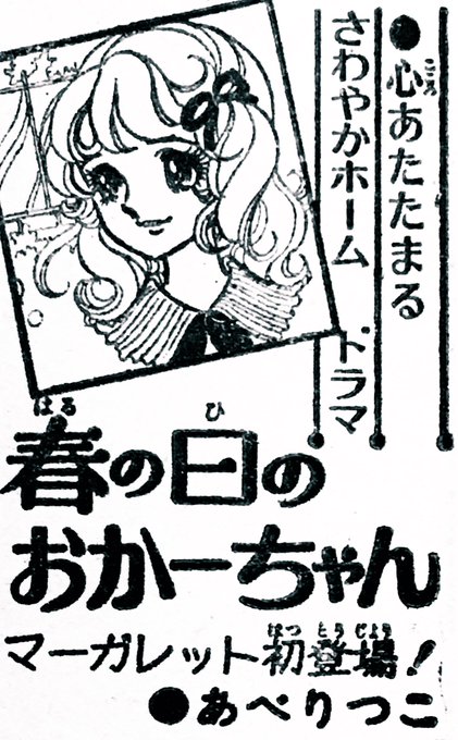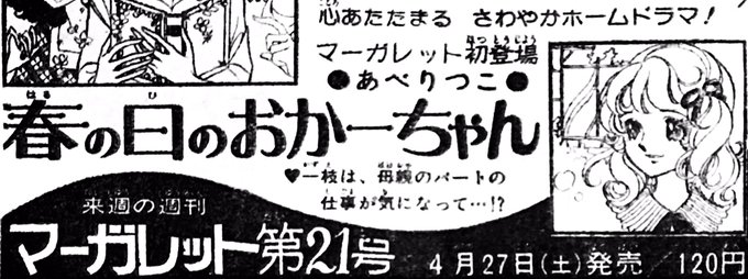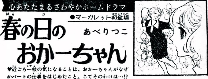 あべりつこ先生の『週刊マーガレット』初登場作品「春の日のおかーちゃん」予告カット。少女だったおかーちゃんと、おかーちゃんになってなお抱き続ける少女時代の思いを考えると、無性に愛おしくなります。