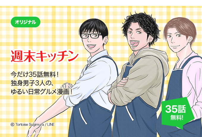 独身男子仲良し3人組が週末に料理したりグルメ旅に出かけたりする、ゆるい日常グルメマンガ!