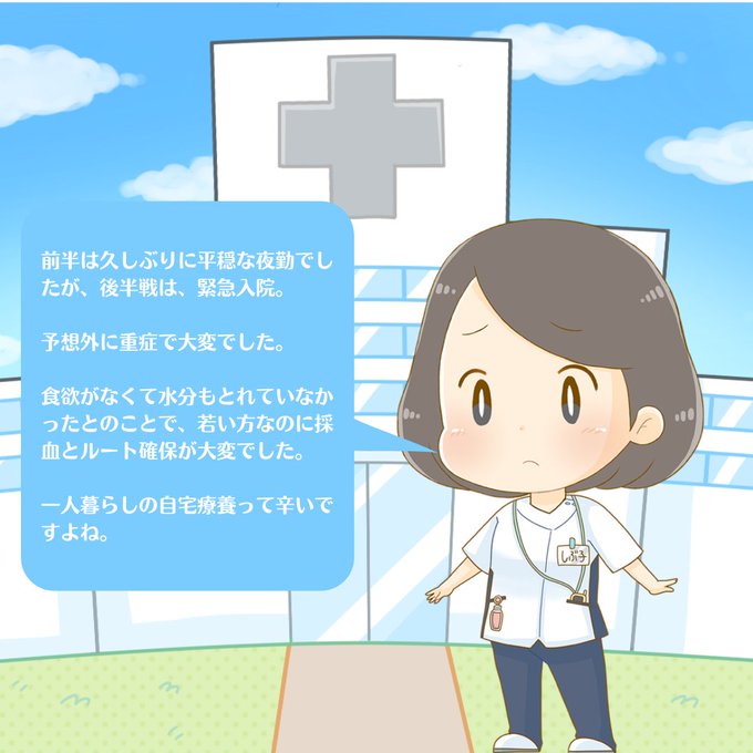 予想外に重症で大変でした。食欲がなくて水分もとれていなかったとのことで、若い方なのに採血とルート確保が大変でした。