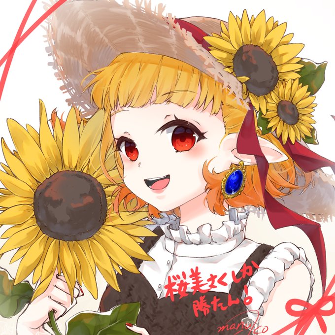 桜美さくちゃん(@sakurabisaku39 )のひまわり衣装実装明日になったんだってっ(*´ω`) やったねまぬこさんFA間に合ったよっ! #銀河一のアート