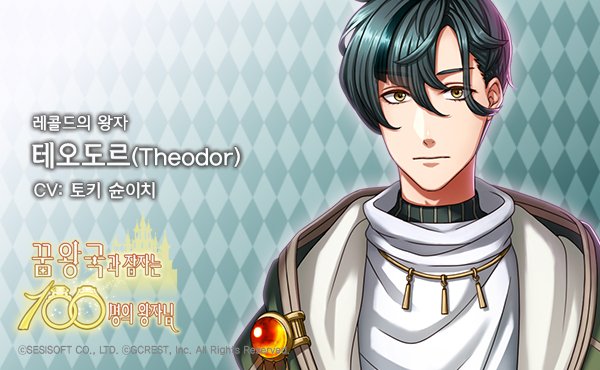 [왕자소개] 테오도르(CV: 토키 슌이치) - 기록의 나라 레콜드의 왕자. 세계의 대중문화에 관한 기록을 담당하고 있다. 매우 성실한 성격이다. 박학다식하지만 말재주가 없으며 본인도 이를 신경 쓰고 있다. #꿈왕국