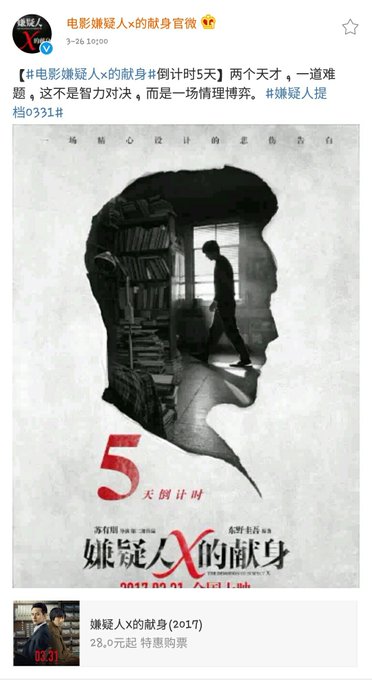 영화 [용의자 x의 헌신] D-5 두명의 천재. 하나의 난제. 이건 두뇌싸움이 아니라 인정에 대한 도박이다. #왕카이 #용의자x의헌신