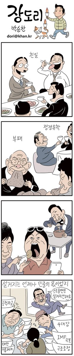 장도리4.21 - 권력자들이 불법적이고 부도덕한 방식으로 얻은 이익을 환수하고 응당한 처벌을 받을 때 국민들은 나라를 되살리는 작업에 호응할 것입니다. 범법자들은 용서하고 애꿎은 민중들만 설거지에 동원돼 온 역사는 이제 그만 반복되어야 합니다.
