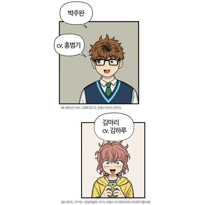 주인공 배역(고해준, 백은영)은 여러분께서 가장 많은 추천을 해주신 성우를, 주인공 성우외에 전체 주요 성우캐스팅은 홍쇼제작진의 논의를 거쳐 완성하였습니다!