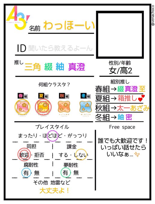 A3界隈の絵師さんに限らずレイヤーさん文字書きさんも大歓迎です☺️💦