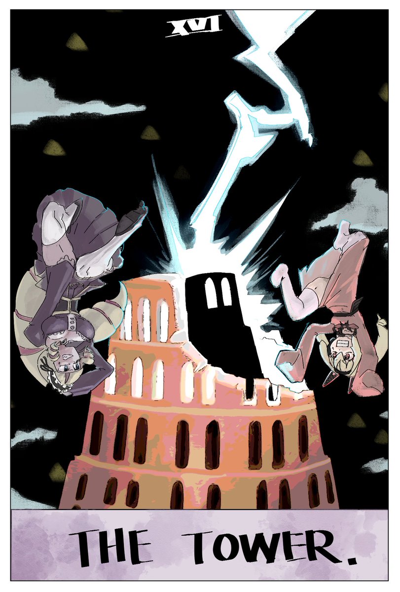 16番目の大アルカナ塔。破綻を象徴するカードです。正逆によって良悪の意味をとることが多いタロットですが、塔はどちらも悪い意味になる非常に縁起の悪いカードです。そんなわけで、なんかいろいろあった二人を描いています。