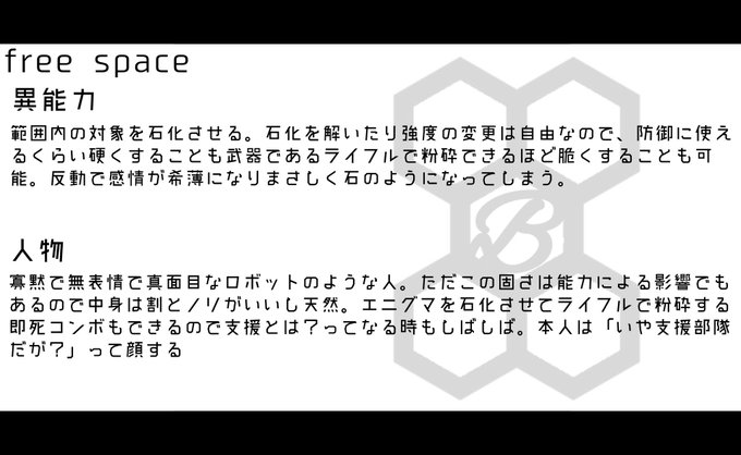こちらの企画【@C_H_TL】に失礼します。 モブ顔の陰キャです!!!! 能力は優秀なのに性格で全てを台無しにします!!仲良くなれる気がしません! よろしくお願いします! #C_H_CS #C_H_隊員 #C_H_情報部隊