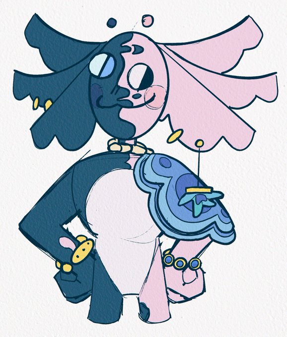 @BillieBustUp I need to update his ref so badly cause he got a color shift but THIS IS MY OC CASPIAN!!! He’s a chimera axolotl who is a traveling merchant selling jewelry and various knick knacks. I don’t have many fun facts about him but he’s partially blind in his right eye