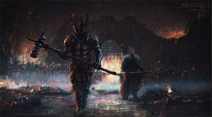 Ilustraciones del final alternativo de Juego de Tronos, en el que los Caminantes Blancos arrasan Invernalia y llegan hasta Desembarco del Rey, donde ocurre la batalla final. Asimismo, Aria iba a matar a Cersei usando la apariencia de Daenerys.