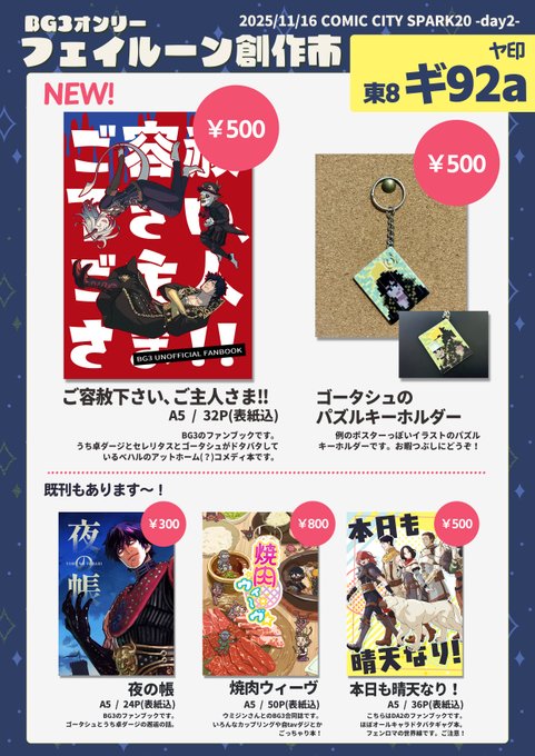 2025/11/16 SPARK20-day2-内、BG3オンリー『フェイルーン創作市 SP2025』の幣サークルのお品書きです~!当日よろしくお願いいたします🥳生きてます~ #フェイルーン創作市 #1116BG3Spark20