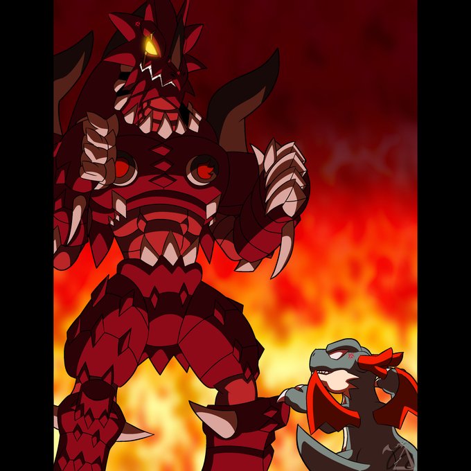 Choosing to live in a volcano, Vermillimon had to adapt to harsh conditions and it's peaceful nature dissapeared, turning it into Dorbickmon, a ruthless warrior, who leads and burns those who stand in it's way.
