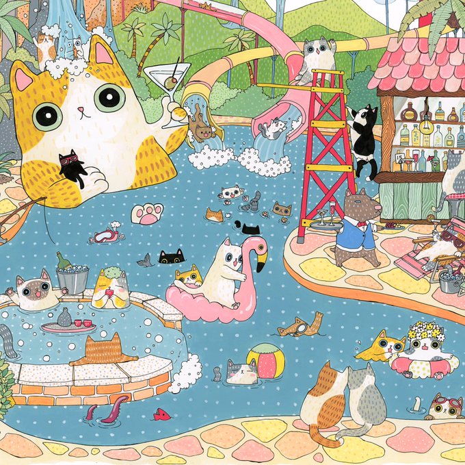 #Summer #Vacation by @mangosilvervine 🍭😎💦 For our #upcoming #exhibition opening June4th🎉 #CatsOfTwitter #Pool #Party