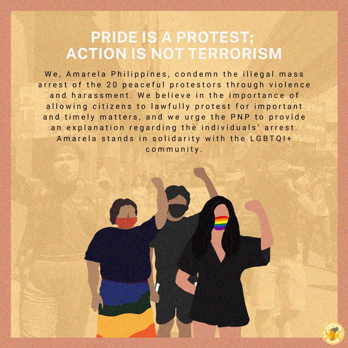 Amarela Philippines stands in solidarity with the LGBTQI+ community in condemning the illegal arrest of the 20 protestors. Pride is a protest, action is not terrorism.