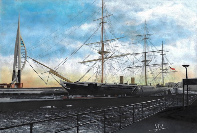 Had a great day at @PHDockyard Historic Dockyard at #Portsmouth recently. After the visit, here's my latest #artwork - @HMSWarrior1860, Britain's first iron-hulled, armoured battleship, with the @SpinnakerTower in the background. #artwork for sale via https://t.co/cY52w7bQ4l