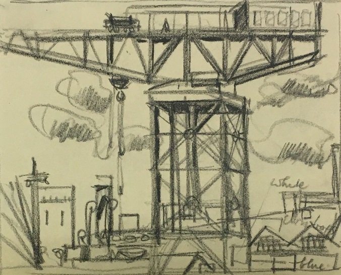 JD Fergusson secured a commission from the Ministry of Information to paint a series of paintings of Portsmouth Dockyard. He spent six weeks there gathering sketches and ideas from which he went on to paint a distinctive series of works now know as his Portsmouth Dockyard series.