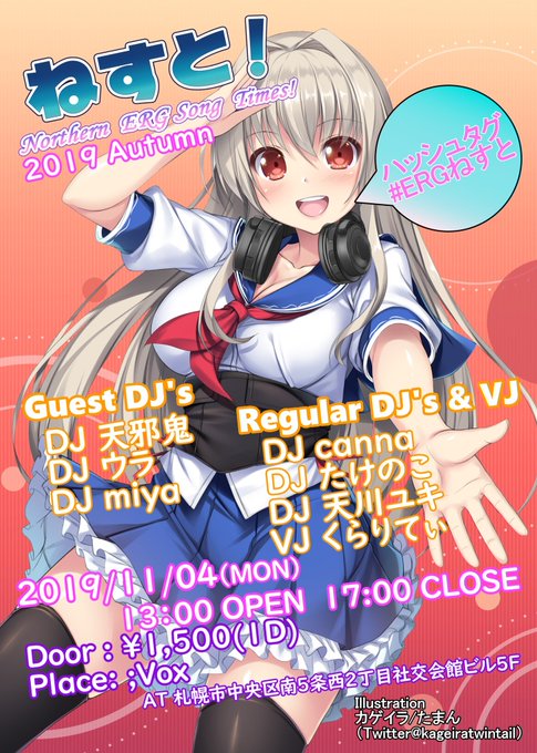 #ERGねすと は「美少女ゲームのDJ/VJになりたい!」「美少女ゲームオンリーでDJ/VJをやってみたい!」といったゲストを募集しています、少しでも興味があったり腕試ししてみたいと思ったらレギュラー(@schwarze9596,@X_canna_X,@takenyan001,@clariA64)にお声かけください!次回開催は11/4(月祝)です!