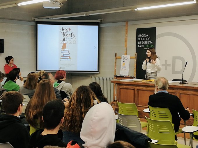 Alumnes de CFGM de Gràfica Impresa i Interactiva presenten les seves propostes de cartell pels #JocsFlorals2020 davant dels seus companys, membres de @consorciedubcn i de Llotja. Enhorabona a Aroa i a la resta de finalistes!