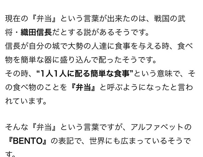 海外でもOBENTO!で通じる私達のお弁当文化。歴史を遡ると南宋時代の中国で発案された由緒あるものみたいなんですけど日本で馴染んだのはもう少し後、我らがぐだぐだ魔王ノッブが流行らせたんだって