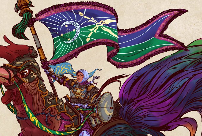 The third and final mounted class drawn for Gubat Banwa, the Sarimanok Knight. Went off hard on this one so here are some detail zooms. Akai Sultanate Flag by @rajavlitra. Links to the TTRPG now in its beta state in the original twee. #GubatBanwa #Artph #RPGSEA https://t.co/D2Ubyghx1P