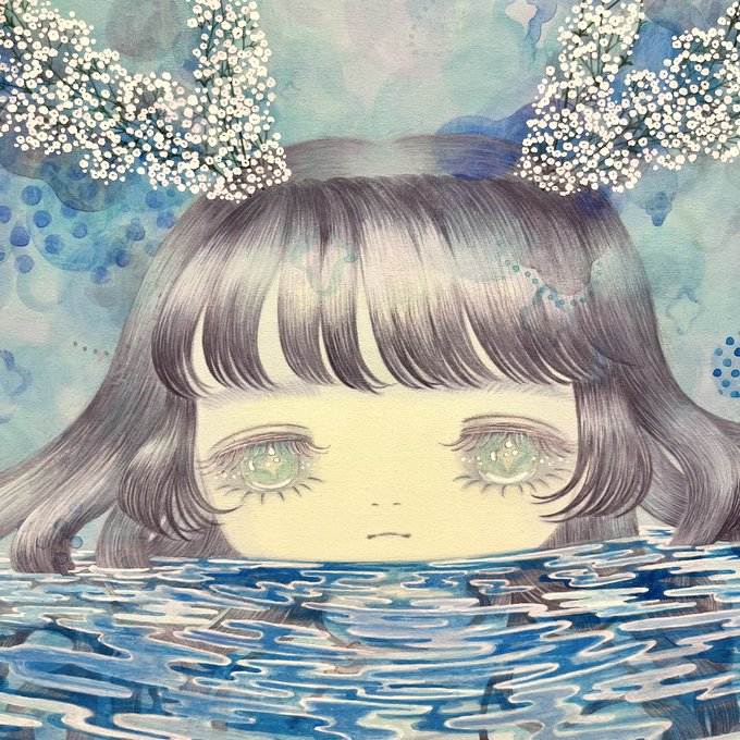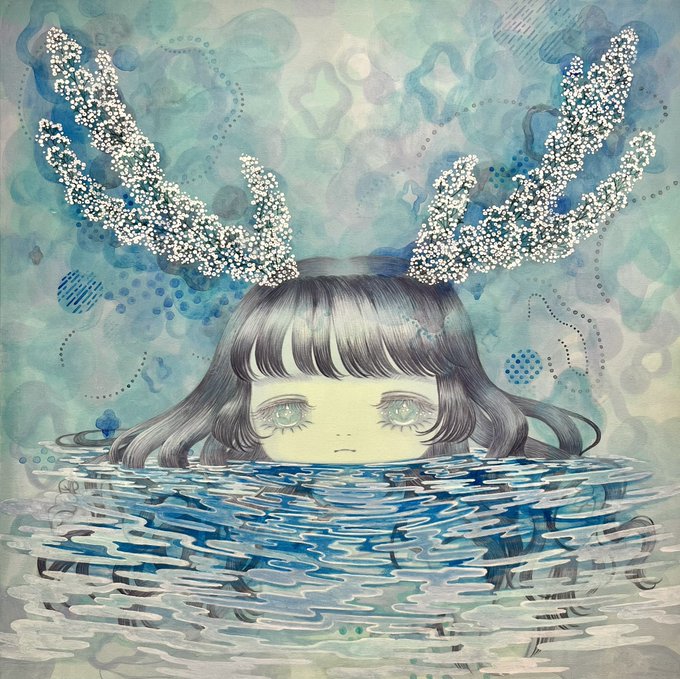 かすみ草のツノ🦌と水面の向こう側に見える髪や手がすき。