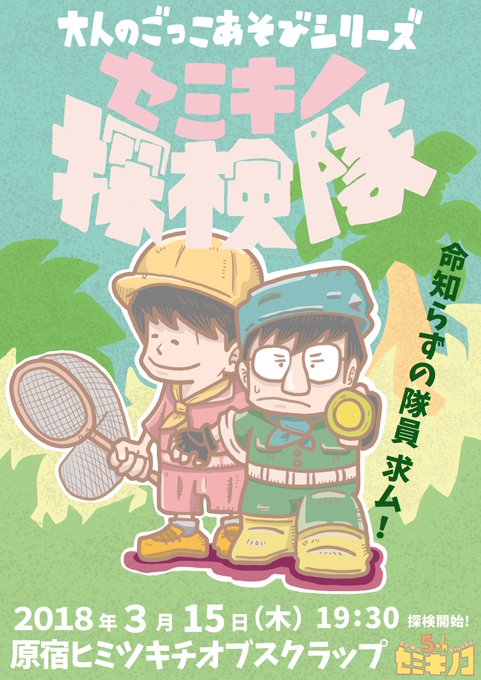 3月15日(木)原宿ヒミツキチにて久々の新作イベント【セミキノ探検隊】が始まります!ぜひ迷彩柄の服を着てお越しください。このヒミツキチというジャングルの中で大冒険します。アナコンダ捕まえよっと。(あ)