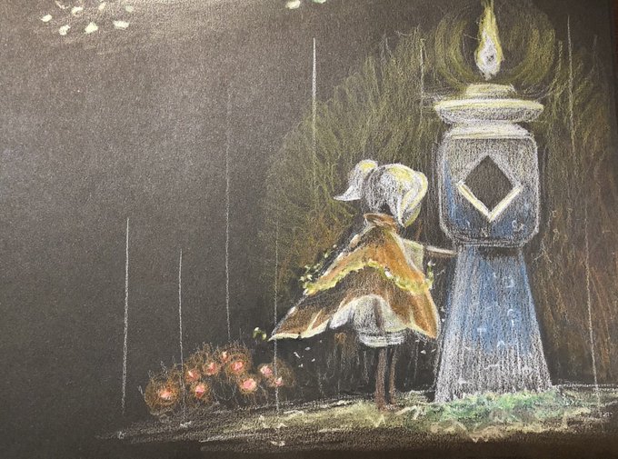 初めて黒い紙に描いた、雨の中灯籠の火にあたる星の子